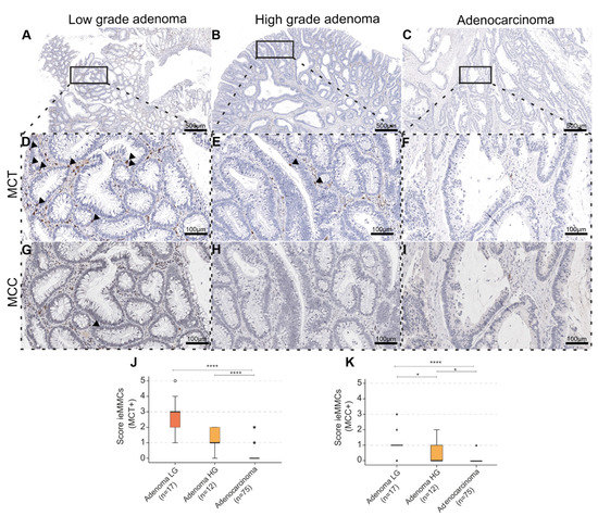 (A–I) In the context of human adenoma-carcinoma progression (A–C), ieMMCs (arrowheads) positive for MCT (D–F) and MCC (G–I) decreased from low-grade (LG) to high-grade (HG) adenoma and adenocarcinoma (ACA) (serial sections); (J,K) Generally, median scores for ieMMCs in adenomas were higher for MCT (KWT, pairwise comparison of ACA-LG **** p < 0.0001; ACA-HG **** p < 0.0001) (J); than for MCC (KWT, pairwise comparison of LG-HG * p = 0.022; HG-ACA *p = 0.017; LG-ACA **** p < 0.0001) (K). * = extreme statistical outliers; ° = mild statistical outliers.