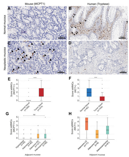 (A–D) Interepithelial mucosal mast cell (ieMMC) (arrowheads) in normal vs. neoplastic colonic mucosa of murine (A,C) and human (B,D) intestine; (E) Generally, scores of ieMMCs were higher in (pre-)neoplastic lesions of mice (Mann-Whitney U test (MWU), **** p = 0.000); (F) Contradictory, human ieMMC scores were higher in normal adjacent tissue (MWU, *** p < 0.001); (G) IeMMCs in the adjacent normal mucosa of mice increased in the course of adenoma-carcinoma progression (KWT, p = 0.690, not significant (ns)); (H) In humans, density of ieMMCs in adjacent normal mucosa decreased from LG adenoma to carcinoma to HG adenoma (KWT, * p = 0.047). * = extreme statistical outliers; ° = mild statistical outliers.