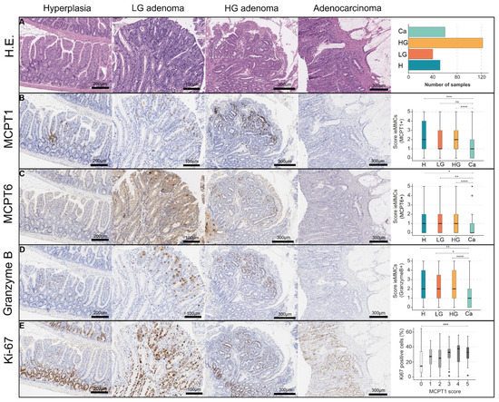 Histological scores for MCPT1+, MCPT6+ and granzyme B+ ieMMCs showed that ieMMC density decreased from precursor lesions (atypical hyperplasia; LG; HG adenoma) to adenocarcinoma (p < 0.001) (Table 4) (Figure 6B–D). In contrast to this finding, ieMMC density in adjacent normal mucosa increased from precursor to carcinomatous lesions (p = 0.690) (Figure 5G).