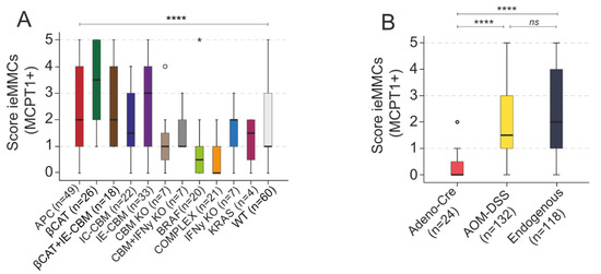 (A,B) Scores for ieMMCs over all tumor grades were compared according to genotype groups (KWT, **** p < 0.0001). For details on the pseudonymized genetically engineered mouse groups, please refer to Supplementary Table S1 (A); additionally, group comparison according to mode of tumor induction was performed (KWT, p < 0.0001) (B). (A) Scores assessed in lesions of BrafV637E mice (BRAF) (n = 20; median score 0.5) were generally low, while scores were highest in lesions of the CatnbΔex3 model (βCAT) (n = 26; median score 3.5); (B) Scores in Adeno-Cre-induced tumors were lower than in AOM-DSS-induced (KWT, pairwise comparison **** p < 0.0001) and in endogenous models’ scores (KWT, pairwise comparison **** p < 0.0001). There was no statistically significant effect between AOM-DSS and endogenous models (p = 0.636; not significant (ns)). * = extreme statistical outliers; ° = mild statistical outliers.