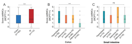 Most strikingly, murine ieMMC scores were generally higher in small intestinal lesions than in colonic neoplasia (p < 0.001, MWU) (Figure 8A). Decreasing ieMMC scores were found in the atypical hyperplasia–adenoma–carcinoma progression of murine colonic lesions (p < 0.001) (Figure 8B). In contrast, strong group differences between ieMMC scores in small intestinal lesions of different tumor grades were not evident (p = 0.222) (Figure 8C).