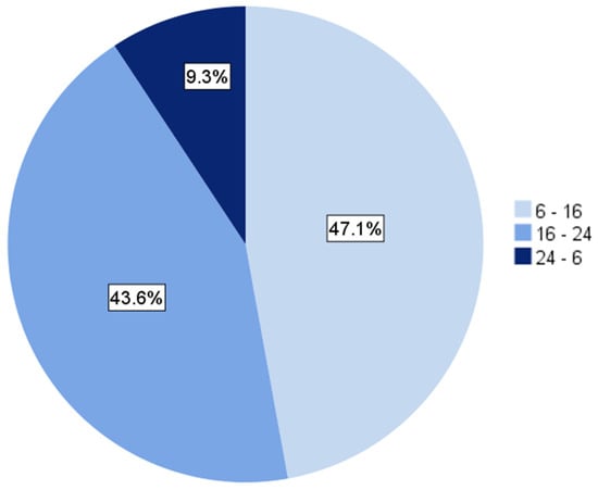 When stratified by the time of day, most patients (47.1%) were admitted during regular working hours between 6 a.m. and 4 p.m. (Figure 2). The time of admission influenced the timing of surgery: patients admitted during the night shift, i.e., between 12 p.m. and 6 a.m., were significantly more likely to undergo early surgery (i.e., within the median; 92.3% vs. 7.7%; p < 0.001; Table 4).