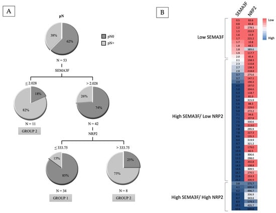 (A): Classification tree according to the transcriptional expression values of SEMA3F and NRP2 considering the presence of occult lymph node metastases as the dependent variable. (B): Heatmap of SEMA3F and NRP2 according to the results obtained in the classification tree.