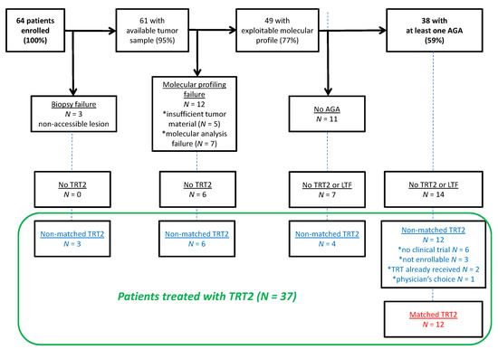 CONSORT diagram. TRT2, systemic treatment delivered for disease progression after PERMED-01 enrollment; AGA, actionable genetic alteration; LTF, lost to follow-up.