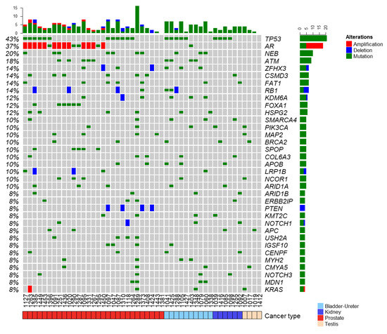Array-based CGH and t-NGS profiles were established from 49 patients (77%). The median time between inclusion and discussion during the MTB was 53 days (range 4–162). We found 633 somatic gene alterations, including 530 mutations and 103 copy number alterations (CNAs: 52 deletions, 51 amplifications). The 35 most frequently altered genes (Figure 2) notably included TP53 (43% of samples), AR (37%), NEB (20%), ATM (18%), FAT1, RB1, CSMD3, and ZFHX3 (14%), KDM6A, FOXA1, and HSPG2 (12%). Of note, some altered genes (FOXA1, SPOP, PTEN, and USH2A) were altered only in PC, in which (Figure S1) the most frequent alteration was AR amplification, followed by TP53 mutation; five genes involved in chromatin remodeling and transcriptional regulation (FOXA1, KDM6A, NCOR1, ARID1A, ZFHX3) were among the top 20 genes altered. Ten out of 29 PC patients (34%) showed an alteration in at least one of 15 genes tested in the PROfound trial [14], mainly ATM (N = 5) and BRCA2 (N = 2). A high HRD score was observed in 20 patients (41% of cases), including 13 PCs, 5 urothelial bladder cancers, 1 kidney cancer, and 1 testis cancer. A positive correlation existed between the HRD score and the presence/absence of mono-/bi-allelic pathogenic alterations of genes involved in homologous recombination (Figure S2). Two PC patients displayed focal tandem duplication associated with CDK12 bi-allelic loss. As expected, they did not show a high HRD score [22]. High TMB was observed in only 1/26 of informative patients (bladder cancer).