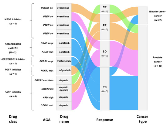 Matched therapies, corresponding AGAs, and therapeutic responses. Matched therapies (drug class and drug name) and corresponding targeted AGAs are indicated. Objective responses are displayed as alluvial plots linking drug, response, and cancer type: responses ordered from CR to PD. CR = complete response, PR = partial response; SD = stable disease, and PD = progressive disease.