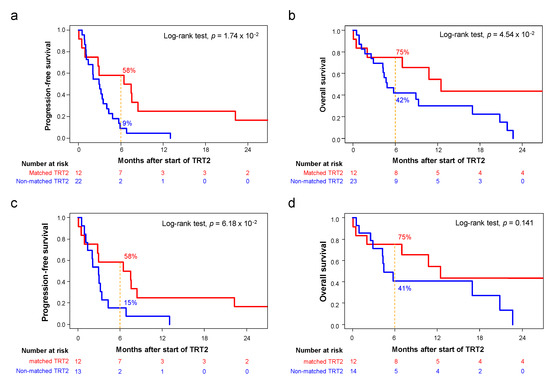 In term of efficacy, 5/12 patients (42%) in the “matched therapy group” had a PFS2/PFS1 ratio ≥ 1.3 versus only 1/25 (5%) in the “non-matched therapy group”. In univariate analysis for PFS2/PFS1 ratio ≥ 1.3, the type of therapy (matched versus non-matched) was the only significant variable (p = 1.36 × 10−2; Table S4). The 6-month PFS2 was longer in the “matched-therapy group” (58%, 95%CI 36–94) than in the “non-matched therapy group” (9%, 95%CI 2-34; p = 1.74 × 10−2; Figure 5a). In term of RECIST response, in the “matched therapy group” (Figure 4), one BRCA2-mutated PC patient (8%) experimented complete response (CR: 8%) with olaparib, three patients displayed partial response (PR: 25%), including one with urothelial cancer and FGFR3 mutation treated with infigratinib, one with PC and BRCA2 deletion treated with pembrolizumab/olaparib combination, and one with PC and PIK3R1 deletion treated with everolimus. Three patients presented stable disease (SD: 25%) and five were progressive (PD: 42%). The objective response (OR) rate was 33% (95%CI 11–65) and the disease control (DC) rate (CR + PR + SD) was 58% (95%CI 28-85). In the “non-matched therapy group”, these rates were 13% (95%CI 3–35) and 22% (95%CI 7–44), respectively. The comparison between both groups showed a trend towards better DC rate in the “matched therapy group” (p = 5.9 × 10−2). The 6-month OS was longer in the “matched-therapy group” (75%, 95%CI 54–100) than the “non-matched therapy group” (42%, 95%CI 26–69; p = 4.54 × 10−2; Figure 5b). Because all patients in the “matched therapy group” had a PC or a bladder/ureter cancer (N = 12), we repeated the same analysis by focusing on patients with PC or bladder/ureter cancer only in the “non-matched therapy group” (N = 15). Here too, the percentage of patients with a PFS2/PFS1 ratio ≥ 1.3 was higher in the “matched therapy group” (42%) than in the “non-matched therapy group” (7%; p = 0.065). The 6-month PFS2 was 58% (95%CI 36–94) in the “matched-therapy group” versus 15% (95%CI 4–55) in the “non-matched therapy group”; p = 6.18 × 10−2; Figure 5c), and the corresponding 6-month OS were 75% (95%CI 54–100) and 41% (95%CI 21–78), respectively (p = 0.141; Figure 5d).