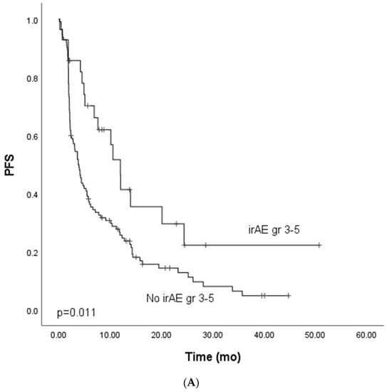 3.2. Immune-Related (ir) Gr3–5 Adverse Events (AEs), PFS and OS