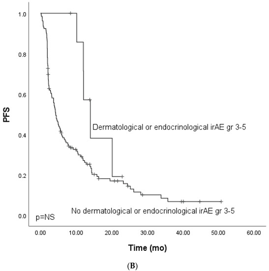 The OS analysis for patients with dermatological or endocrinological irAEs showed a tendency for improved survival (HR 0.56, CI 95% 0.21–1.53). However, the OS did not reach clinical significance, probably due to the cohort’s small size (Figure 2B).
