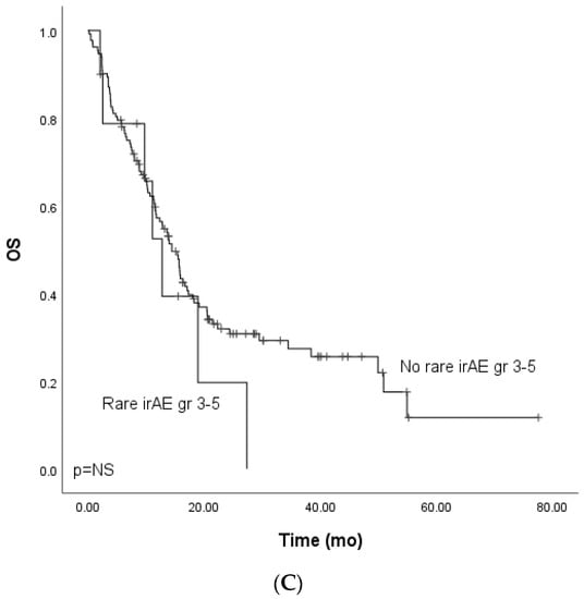 Kaplan–Meier analysis for the overall survival for patients with (A) grade ≥ 3 immune-related adverse events; (B) grade ≥ 3 dermatological or endocrinological immune-related adverse events; (C) rare grade ≥ 3 immune-related adverse events. Crosses indicate censored events.