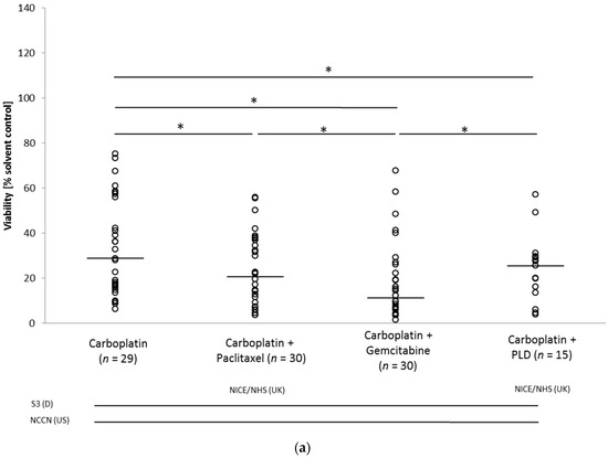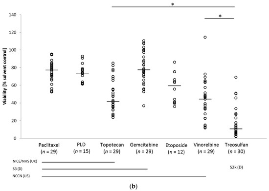 Scatter plot of chemotherapeutic response obtained in patient-derived ovarian cancer spheroid model of total patient cohort against standard (a) platinum- and (b) nonplatinum-based therapies. Dots, tumor samples. Short bars, median cell viability for each treatment option. Long bars, treatment recommendations in different national and international guidelines at time of sample recruitment. PLD, PEGylated liposomal doxorubicin; * p < 0.05.