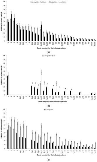 Comparison of different platinum-based treatment options in patient-derived ovarian-cancer spheroid model of individual patients. Each bar represents a treatment option. (a) Carboplatin + paclitaxel compared to carboplatin + gemcitabine; (b) best therapy from (a) compared to carboplatin + PLD; (c) best therapy from (a,b) compared to carboplatin monotherapy. Each number on x-axis represents an individual patient. In seven patients (5, 8, 9, 10, 14, 16, 22), tumor samples from different locations were comparatively analyzed: O, omental lesion; P1, peritoneal lesion 1; P2, peritoneal lesion 2. Gaps indicate that not all treatment options could be tested in all tumor samples as described in Section 2.