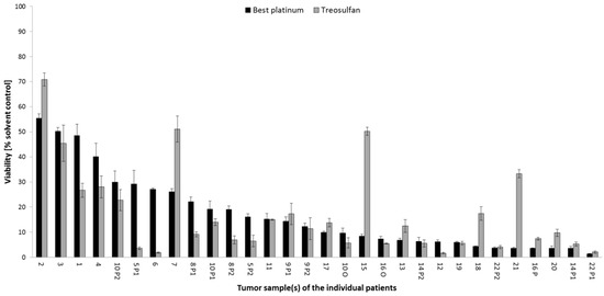 In contrast, all but one nonplatinum-based treatment option intended for platinum-resistant relapses showed a lesser effect on patient-derived cancer spheroids compared to that of carboplatin-based treatments. Treosulfan treatment resulted in strong reduction in spheroid viability that was superior to that of topotecan (treosulfan median 10.58% vs. topotecan median 41.51%, p < 0.0001) and vinorelbine (treosulfan median 10.58% vs. vinorelbine median 44.31, p < 0.0001). Treatment results of the nonplatinum-based drugs are depicted in Figure 1b. Remarkably, in five patient samples (2, 5P1, 10P1, 10P2, 15), nonplatinum treatment stimulated metabolic activity in the spheroid model.