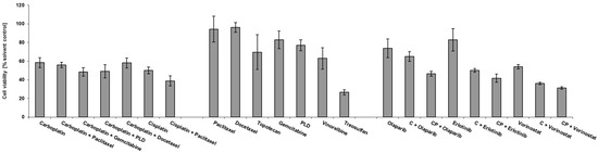 In 22 of 30 samples (73.33%), treosulfan had a similar (n = 13) or even higher (n = 9) effect on spheroid viability compared to the best platinum combination. For two low-platinum-sensitive tumors (1, 4), treosulfan was an effective treatment option (Figure 3). Further-line treatment reports documented the frequent modification of second-line and subsequent treatments in a number of patients resulting in short survival (Table 2). This finding supports the intensive search for further therapeutic options for individual patients. Comprehensive drug screening in platinum-resistant tumors, such as Patient 1, included not only guideline-recommended nonplatinum treatment options, but also a number of targeted therapies. Molecular drugs olaparib, erlotinib, and vorinostat, when administered as single agents, had a weak effect on spheroid viability, but this improved in combination with chemotherapy in this patient sample (Figure 4). For olaparib, the effect was only present in addition to CP, where viability was further reduced from 55.98% to 46.56%. The addition of erlotinib further reduced the cell viability of C (58.45% to 50.02%) and CP (55.98% to 41.83%), whereas vorinostat had greater impact, further reducing the cell viability of C (58.45% to 36.12%) and CP (55.98% to 31.30%).