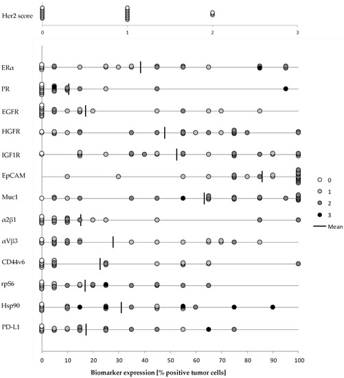 Sections were evaluated semiquantitatively. The percentage of positively stained carcinoma cells is given for each antigen. Staining intensity was classified as weak, moderate, or strong. Her2/neu expression was scored according to breast-cancer [23] and gastric-cancer [24] guidelines. Tumors were defined as hormone receptor positive if ≥1% of the cancer cells revealed a nuclear staining of ER or PR, according to international breast-cancer guidelines [25]. PD-L1 positivity was defined as ≥1%, as described in clinical trials [26,27]. For all biomarkers, the mean expression was calculated.