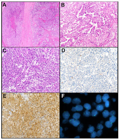 Thymic adenocarcinoma (same case as Figure 1A–C). (A) This adenocarcinoma was comprised of solid (left-hand side and Figure 1A,B) and papillary (right-hand side) patterns. (B) Neoplastic cells are lining thin fibrovascular cores consistent with a papillary growth pattern. (C) In some areas, the tumor was comprised of a spindle cell/sarcomatoid component. (D) mTAP expression was lost in the tumor cells of the sarcomatoid component (and the solid component that is shown in Figure 1A,B, respectively, not shown), while mTAP expression was preserved in other areas of the tumor (E). (F) Homozygous deletion of CDKN2A (fluorescence in situ hybridization [FISH], two green signals and no red signal) was observed prepared from the same tumor area that showed loss of expression of mTAP (D). FISH studies were not performed in tumor areas that revealed expression of mTAP in tumor cells. Magnification, H&E × 40 (A), × 200 (B,C), mTAP × 200 (D,E), CDKN2A FISH × 1000 (oil) (F).