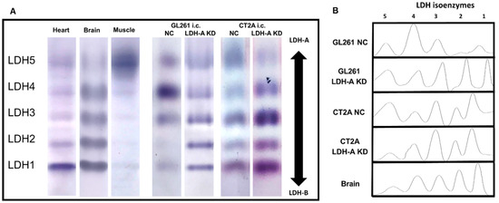 Therefore, we decided to investigate and compare the impact of LDH-A depletion (both LDH-A shRNA knockdown (KD) and treatment with a specific LDH-A/B inhibitor (GNE-R-140)) on the expression of LDH-B in different murine glioma cell lines and corresponding i.c. tumors. We show that control intracranial GL261 tumors shift from an LDH-A (LDH4 dominant) to an LDH-B (LDH1 dominant) pattern and phenotype following LDH-A KD and treatment with GNE-R-140. These changes in the LDH isoenzyme profile and changes in tumor phenotype were not observed in CT2A or ALTS1C1 NC and LDH-A KD tumors. The level of LDH-A expression and its interplay with LDH-B can lead to metabolic changes and complex interactions between tumor cells and their environment. These interactions need to be carefully assessed, since the inhibition of glycolysis in tumor cells may lead to the activation of other metabolic pathways (e.g., lipid, fatty acid, oxidative) and to phenotypic changes, including increased tumor aggressiveness.