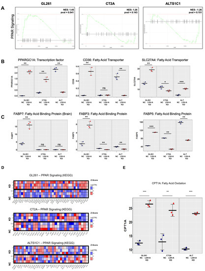 We performed RNA sequencing (RNASeq) to analyze the cellular transcriptome in all six cell lines (GL261, CT2A and ALT; both scrambled NC and LDH-A shRNA KD) to investigate changes in their expression patterns to define the metabolic pathways upregulated in cells. We confirmed LDH-A depletion in our LDH-A KD cell lines and documented that there was a significantly greater enrichment of oxidative phosphorylation pathway genes (at the mRNA level) in GL261 LDH-A KD cells compared to the other cell lines (accompanying manuscript [17,18]. Here we show an upregulation of fatty-acid catabolism genes, specifically in GL261 LDH-A depleted cells (compared to CT2A or ALT KD cells) (Figure 3). We performed Gene Set Enrichment Analysis (GSEA) from the Kyoto Encyclopedia of Genes and Genomes (KEGG) for lipid and fatty-acid metabolism pathways in each cell line. The analysis revealed a significant enrichment of Peroxisome Proliferator-Activated Receptor (PPAR) signaling pathway genes in GL261 LDH-A KD cells (Figure 3A). The PPAR signaling pathway involves a receptor-activated nuclear transcription factor superfamily that is activated by a diverse number of ligands, and it functions as a transcriptional regulator of many biological processes, including lipid/fatty-acid transport and metabolism, cell proliferation, differentiation, apoptosis, and inflammatory responses, among others. Specific PPAR pathway gene enhancements include: (i) a master regulator of lipid metabolism (PPARGC1A; also known as PGC1-alpha), (ii) lipid transporters (CD36 and SLC27A4) and (iii) intracellular lipid-binding proteins (FABP7/3/5); they were significantly and consistently upregulated in GL261 LDH-A KD cells (Figure 3B). Z-transformed scores of individual genes within the PPAR pathway were plotted across each GBM cell line (GL261, CT2A, and ALTS1C1), showing the greatest enrichment of PPAR pathway genes in GL261 LDH-A KD cells (Figure 3C). Expression (TPM) of a key mitochondrial enzyme involved in fatty-acid metabolism (a component of the PPAR pathway activity)—carnitine palmitoyltransferase I (CPT1A)—is shown for each cell line (Figure 3D). These patterns strongly suggest that GL261 LDH-A depleted cells may be able to utilize lactate and/or fatty acids to support their TCA cycle and increased oxidative phosphorylation.