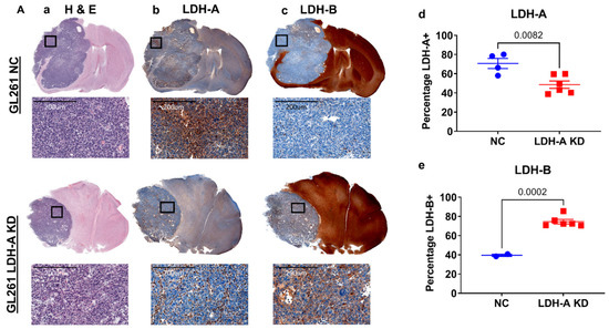 In order to better understand how the interplay between LDH-A and LDH-B subunits in the isoenzyme tumor profiles affect the distribution of the proteins in i.c. tumors, we performed immunohistochemistry, with specific staining for LDH-A and LDH-B. H&E staining showed a relatively homogenous pattern for both i.c. GL261 and CT2A tumors, with little necrosis or stroma, and minimal infiltration of adjacent brain tissue (Figure 4(Aa,Ba), left column). LDH-A and LDH-B immunohistochemistry showed a more variable pattern of staining for both tumors (Figure 4(Ab,Ac,Bb,Bc); middle two columns). A Weka analysis showed significantly greater LDH-A staining in GL261 NC and CT2A NC tumors compared to the LDH-A KD tumors (Figure 4(Ad,Bd), far right graphs; Table S1). In contrast, a significantly greater LDH-B staining pattern was observed in GL261 LDH-A KD tumors (compared to the NC tumors), whereas there was no LDH-B staining difference between CT2A LDH-A KD and NC tumors (Figure 4(Ae,Be), far-right graphs; Table S1). These results are consistent with the isoenzyme profiles (Figure 2) and they confirm (i) downregulation of LDH-A expression in i.c. GL261 and CT2A LDH-A KD tumors compared to the NC controls, and (ii) upregulation of LDH-B expression in i.c. GL261 LDH-A KD tumors, but not in CT2A LDH-A KD tumors.