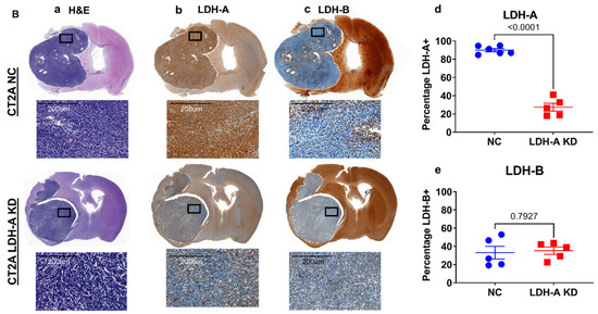 LDH-A and LDH-B immunohistochemistry of i.c. GL261 and CT2A gliomas. H&E staining for GL261 (Aa) and CT2A (Ba) i.c. tumors (both NC and LDH-A KD); corresponding LDH-A (Ab,Bb) and LDH-B (Ac,Bc) immunohistochemistry. The 4 sets of i.c. tumors were grown in immunocompetent C57BL/6 mice. Quantification of percentage of tumor-cell staining (Weka segmentation analysis) for LDH-A (Ad,Bd) and LDH-B (Ae,Be) is shown in Ad, Ae, Bd, and Be; mean ± SEM.