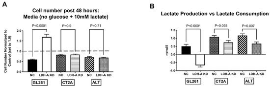 Fourth, lactate production and consumption were evaluated under the same growth conditions noted above. Lactate was measured in the media before and after a 48 h incubation of the six experimental cell lines (Figure 5B). Subtracting the preincubation lactate measurement from the post-48 h incubation lactate measurement demonstrated whether there was net lactate production (+value) or consumption (−value) (Figure 5B). Again, only GL261 KD cells showed a “consumption” of lactate during the 48 h incubation period, consistent with LDH-B dominance of its isoenzyme profile upon the LDH-A downregulation. All the other cell lines (including GL261 NC) showed a net “production” of lactate, consistent with LDH-A dominance. As expected, all the NC cells produced more lactate than the KD cells. These results further suggest that despite lactate being recognized as a waste product in the past, it can be used by variety of cancer cells for OXPHOS and in combination with glycolysis for ATP production [3]. Furthermore, GL261 NC cells produced less lactate than CT2A and ALTS1C1 NC cells (Figure 5B), which is also consistent with the lower expression of LDH-A in GL261 cells compared to that in CT2A and ALTS1C1 cells (Figure 5A and accompanying manuscript [17,18]).