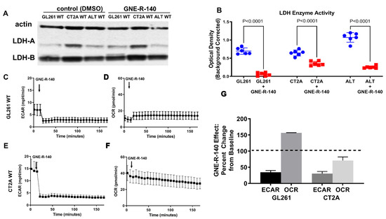 GNE-R-140 effects on GL261, CT2A and ALTS1C1 wild-type cells. Western blot expression of LDH-A and LDH-B proteins, in the presence of vehicle (DMSO) and drug (GNE-R-140, 10 µM) for WT murine glioma cells (A). Effect of GNE-R-140 (10 µM) on LDH enzyme activity of WT murine glioma cells (B). Effect of adding GNE-R-140 (10 µM) to the medium on ECAR—glycolysis (C,E) and OCR (OXYPHOS) (D,F) of GL261 WT cells (C,D), and of CT2A WT cells (E,F), respectively. Panel (G) shows the percentage change over 150 min in ECAR and OCR from baseline (100%) for GL261 and CT2A WT cells, when treated with GNE-R-140. Mean ± SEM. The native Western blot for Panel A is shown in the Supplement (Figure S7).