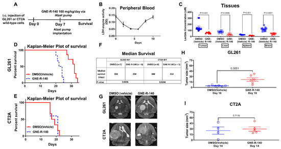 GNE-R-140 treatment effects on GL261 and CT2A i.c. tumors. Outline of the experimental protocol for evaluating the LDHA inhibitor (GNE-R-140) (A). Time course of GNE-R-140 treatment effect on venous blood (RBC) LDH enzyme activity (B). Ex vivo intracellular lactate concentration from GL261 tumors and tissue extracted at day 10, comparing GNE-R-140 treatment vs. vehicle (DMSO) control treatment (C). Kaplan–Meier plots of animal survival following i.c. implantation of WT GL261 and CT2A tumors and treatment (D,E). Median animal survival time is shown in the table (F). Representative T2-weighted MRI images of GL261 tumors (at day 16 post-implantation), and CT2A tumors (at day 14 post-implantation); 7 days after initiating GNE-R140 treatment (G). Comparison of MRI-measured tumor size on indicated days for GL261 (H) and CT2A (I) wild-type tumors following GNE-R-140 and vehicle treatment.
