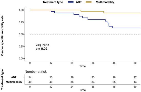 In Kaplan–Meier plots depicting CSM (Figure 1), a higher mortality rate was associated with ADT-alone delivery (5.9 vs. 37.1%; p = 0.02).