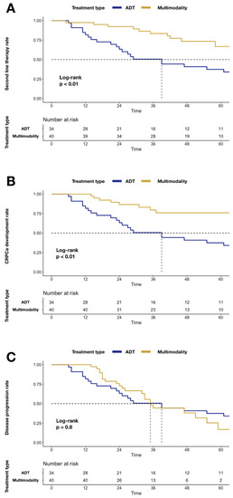 Kaplan–Meier plots depicting differences after stratification according to MMT vs. ADT alone: Panel (A) differences in second-line systemic therapy rate; Panel (B) differences in mCRPC rate; Panel (C) differences in disease progression rate. Abbreviations: cancer-specific mortality (CSM); androgen deprivation therapy (ADT); multimodality treatment (MMT); metastatic castration-resistant prostate cancer (mCRPC).