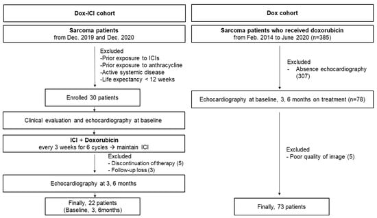 Patients with histologically confirmed metastatic and/or recurrent sarcoma between December 2019 and December 2020 were enrolled in a prospective clinical trial (ClinicalTrials.gov Identifier: NCT03802071) according to the following criteria (Dox-ICI cohort): (1) age ≥19 years, (2) LVEF at baseline echocardiography ≥50%, and (3) without prior exposure to ICIs and anthracycline. Briefly, patients received concomitant ICI (durvalumab, 1500 mg) with doxorubicin (75 mg/m2) every three weeks for 6 cycles followed by maintenance treatment with ICI (durvalumab) every three weeks. The dose of doxorubicin was reduced if there were any side effects.