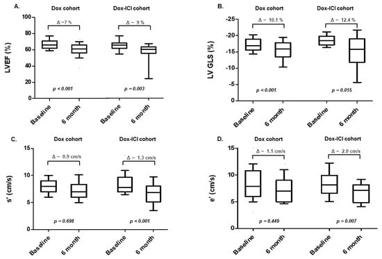 Changes in echocardiographic parameters after chemotherapy. (A,B) reveal that LVEF and LVGLS were significantly reduced after chemotherapy in both cohorts. (C,D) show that tissue Doppler imaging velocities (S’ and e’) were significantly decreased in the Dox-ICI cohort, but not in the Dox cohort.