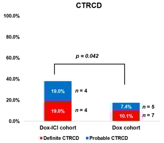 In the Dox cohort, definite and probable CTRCD were observed in seven (10.1%) and five (7.4%) patients, respectively, whereas in the Dox-ICI cohort, it was observed in four (19%) and four (19%) patients, respectively. The total number of patients who developed CTRCD was significantly higher in the Dox-ICI cohort than in the Dox cohort (38.0% vs. 17.4%, p = 0.042) (Figure 3). Among those with definite CTRCD, 11 (100%) patients showed symptoms of heart failure, and 10 (91%) of those discontinued chemotherapy. In the definite CTRCD of the Dox group, one out of seven patients developed definite CTRCD before six cycles of doxorubicin. Six out of seven patients developed definite CTRCD after six cycles of doxorubicin. These patients discontinued doxorubicin and received guideline-directed medical treatment for heart failure; they showed improvement in cardiac function with LVEF being increased to >50%. In the definite CTRCD of the Dox-ICI group, four patients developed definite CTRCD after six cycles of doxorubicin and durvalumab. These patients also discontinued doxorubicin and durvalumab and received medical treatment for heart failure according to symptoms and laboratory results. Three out of four had follow-up images, whereas the remaining one was lost to follow-up due to cancer progression. All three patients showed improvement in cardiac function (with LVEF ≥50%) 6 months to 1 year after treatment of heart failure.