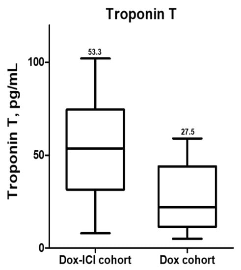 In patients with CTRCD, the level of troponin-T was significantly more elevated in the Dox-ICI cohort than in the Dox cohort.