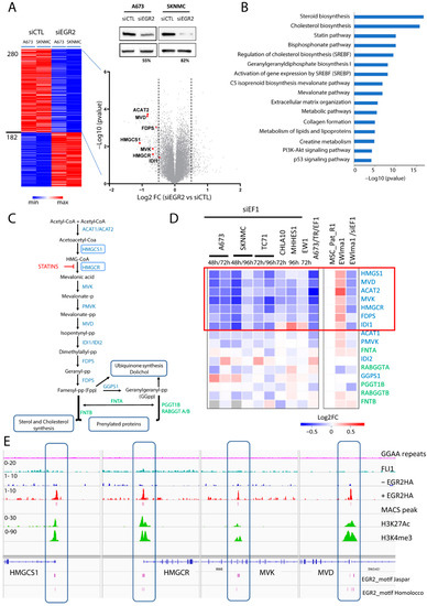 EGR2 regulates the expression of mevalonate pathway enzymes in Ewing cells. (A) Heat map of differentially expressed genes in the A673 and SKNMC Ewing cell lines obtained from the mean of two siEGR2 (#1 and #2) (absolute log2FC > 0.5) and Western blot analysis of EGR2 expression cells for 48 h after siEGR2 or siCTL transfection. The volcano plot shows the differentially expressed genes in A673 and SKNMC Ewing cells upon siEGR2 vs. siCTL transfection. The dotted line corresponds to the absolute value of log2FC = 0.5 and the red dots point out mevalonate pathway genes down-regulated by EGR2-KD. (B) Gene Ontology and pathway analysis using the Topp-Fun Gene portal performed on the 280 genes down-regulated upon EGR2-KD with a log2FC < −0.5 comparing siEGR2 vs. siCTL. (C) Schematic representation of the mevalonate pathway. The blue boxes indicate the 2 rate-limiting enzymes. (D) Heat map representation of the differential expression of mevalonate pathway enzymes (in blue) and prenyltransferases (in green) in 6 Ewing cell lines after invalidation with siRNA targeting EWSR1-FLI1 (siEF1) for 48 h (A673 and SKNMC), 72 h (A673, TC71, CHLA10, and EW1), and 96 h (SKNMC, TC71, and MHHES1) and in the A673/TR/shEF1 inducible system (shEF1) treated with Dox for 7 days [24] and parental MSC cells (MSC_Pat_R1) as well as in EWIma1 cells invalidated or not for 72 h by siEF1. EWIma1 was generated by engineering an EWSR1-FLI1 translocation in a Mesenchymal Stem Cell (MSC_Pat_R1) [19]. The red box shows the 7 enzymes commonly up-regulated by EGR2 and EWSR1-FLI1. (E) CHIP-seq profiles for EWSR1-FLI1, EGR2, H3K27Ac, and H3K4me3 binding to HMGCS1, HMGCR, MVK, and MVD promotors in the POE shEGR2_4#22 clone [13] expressing a tagged EGR2 (EGR2HA). The endogenous EGR2 was invalidated by shRNA induced upon Dox treatment (+EGR2HA) or not (−EGR2HA).