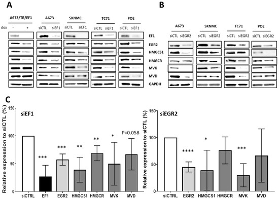 EWSR1-FLI1 and EGR2 regulate the protein expression of the mevalonate pathway in Ewing cells. (A,B) Western blot analysis of HMGCS1, HMGCR, MVK, and MVD expression in total lysates of the A673, SKNMC, TC71, and POE Ewing cell lines transfected with a control siRNA (siCTRL) or with siRNA targeting EWSR1-FLI1 (siEF1) (A) or EGR2 (siEGR2#1) (B) for 72 h. The A673/TR/shEF1 inducible cellular model was treated with doxycycline for 7 days (+Dox) to invalidate the EWSR1-FLI1 expression or was untreated (−Dox). (C) Quantification of protein expression levels of EWSR1-FlI1, EGR2, HMGS1, HMGCR, MVK, and MVD after invalidation by siRNA of EWSR1-FLI1 (siEF1) or EGR2 (siEGR2#1) for 72 h; the graph represents the relative expression to siCTRL for each cell line. The histograms correspond to the mean value of all Ewing cell lines (n = 4). Data are presented as mean +/− SD. **** p value < 0.0001, *** p value < 0.001, ** p value < 0.01, * p value < 0.05 versus siCTRL.