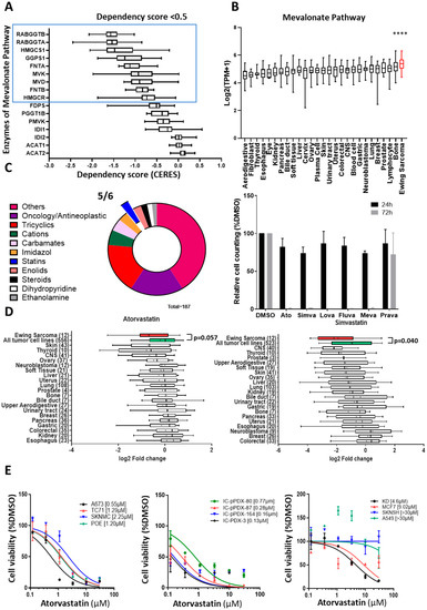 Ewing sarcoma tumors and cell lines are sensitive to statin treatment. (A) Boxplot of median dependency scores for mevalonate pathway enzymes and prenyltransferases in 25 Ewing sarcoma cell lines upon CRISPR lethality screening (DepMap portal, Avana library). The blue box highlights genes with a median dependency score < −0.5 in Ewing cell lines. (B) Comparison of the mean expression level of mevalonate pathway enzymes and prenyltransferases across various tumor cell lines (DepMap portal) [33]. Data are presented as min-to-max boxplots with median; **** p value < 0.0001, unpaired Student’s t-test with Welch’s correction. (C) Results of the high-throughput compound screening using the Prestwick library with one dose of treatment (10 µM) and two time points (24 h and 72 h) using the A673 Ewing cell line. Among the 187 hit compounds, 110 compounds can be grouped into 10 different functional and structural families. A total of 5 out of 6 statins available in the Prestwick library induced a decrease in cell proliferation after 24 h of treatment and demonstrated major cytotoxicity at 72 h. (D) Boxplots of the log2FC of fluorescent intensity of the different tumor groups upon Atorvastatin and Simvastatin treatment normalized to DMSO treatment. The red boxplots correspond to Ewing cell lines and the green boxplots to the mean of all other tumors. Data are represented as 10–90% percentiles with median (line) and mean (dot) obtained with Bayesian Student’s t-tests (data from the DepMap portal). (E) Dose–response curves and IC50 values of Atorvastatin for 4 Ewing cell lines (A673, TC71, SKNMC, and POE), 4 dissociated cells from Ewing PDX (IC-pPDX-80, IC-pPDX-87, IC-pPDX-164, and IC-pPDX-3), and 4 non-Ewing cell lines (KD, malignant rhabdoid tumor; SKNSH, neuroblastoma; MCF7, breast cancer; A549, lung carcinoma). Cell viability was quantified by cell counting with trypan blue exclusion after 72 h of treatment with 6 doses of atorvastatin and expressed as the percentage relative to cells treated with DMSO (n = 2).