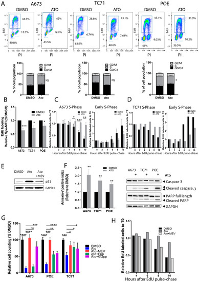 Atorvastatin induces an MVA pathway-dependent slowdown of the S-phase of cell cycle and apoptosis. (A) Analysis of cell cycle by EdU staining in A673 (n = 3 biological replicates), TC71 (n = 2 biological replicates), and POE (n = 3 biological replicates) Ewing cells with X2 IC50 doses of Atorvastatin for 72 h. (B) Atorvastatin induces a decrease in EdU incorporation during the S-phase. The graph represents specific MFI of EdU-labeled cells relative to DMSO for each cell line (n > 3 biological replicates). (C,D) Analysis of cell-cycle progression by EdU pulse–chase method in the A673 (n = 3 biological replicates) (C) and TC71 (n = 1) (D) cell lines treated, respectively, with 1 µM and 5 µM Ato for 72 h (80% of proliferation inhibition). Cells were collected 2, 4, 6, 8 h, and 10 h after EdU pulse. The histograms represent the EdU-labeled cells relative to T0 (start point after EdU pulse) during the S-phase and early S-phase. (E) Analysis of p21 expression in the A673 cell line treated with 0.5 µM Atorvastatin for 72 h and with rescue by MEV (100 µM). (F) Study of apoptosis by Annexin-V-staining assay and by assessing the presence of cleaved caspase-3 and cleaved-PARP by Western blot in 3 Ewing cell lines (A673, TC71, and POE) treated for 72 h with 0.5 µM (IC50), 2.6 µM (IC50 × 2) and 2.4 µM (IC50 × 2) Atorvastatin, respectively (n > 5 biological replicates). (G) Measurement of cell viability 72 h after Atorvastatin treatment at 2 × IC50 (A673, 1 µM; TC71, 2.6 µM; POE, 2.4 µM) with rescue by Mevalonic acid (MEV) (100 µM), Farnesyl pyrophosphate (Fpp) (10 µM), or GeranylGeranyl-pyrophosphate (GGpp) (10 µM) metabolites (n = 3 biological replicates). Data are presented as mean +/− SEM (A,B,F) or +/− SD (C,G). **** p value < 0.0001, *** p value < 0.001, ** p value < 0.01, * p value < 0.05 versus DMSO (A,B,F,G) or versus Ato treatment (G), unpaired Student’s t-test. (H) Atorvastatin induces a decreased EdU incorporation during the S-phase with rescue by MEV (100 µM) in the A673 cell line. The barplot represents the EdU-labeled cells relative to T0 (start point after EdU pulse) during the S-phase 4, 6, 8, and 10 h post EdU pulse (n = 1).