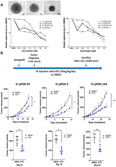 For the 3D culture, single spheroids per well were formed from 800 dissociated cells derived from a PDX tumor in a low ultra-attachment 96-well plate (ULA plate; 7007; Corning). After 4 days of spheroid formation, the serial dilution of statins (30 µM->0.12 µM) was added for 7 days. Images of spheroids were taken on a Leica microscope with a DFC 3000G camera at 10× magnification. The growth of spheroids was measured on day 7 by area calculation using imageJ software. All experiments were performed in duplicate. The measure of the surface area of spheroids was normalized to spheroids treated with DMSO.