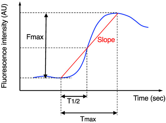 Time curve of the ICG fluorescence intensity. Fmax, Tmax, T1/2, and Slope were calculated.