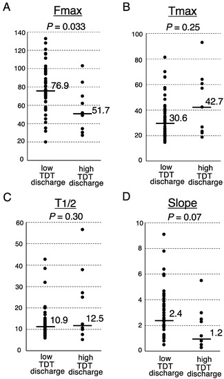 Finally, we investigated the association between the postoperative fecal volume and ICG fluorescence-related parameters at the transection portion of the proximal colon (Figure 1). The Fmax of the low TDT discharge group was significantly higher than that of the high TDT discharge group (median, 76.9 arbitrary units (AU) vs. 51.7 AU, respectively; p = 0.033, Mann-Whitney U test) (Figure 2). The Slope of the low TDT discharge group tended to be higher than that of the high TDT discharge group (median 2.4 vs. 1.2 AU/sec, respectively; p = 0.07). Meanwhile, no significant difference was observed between the two groups regarding the Tmax or T1/2.