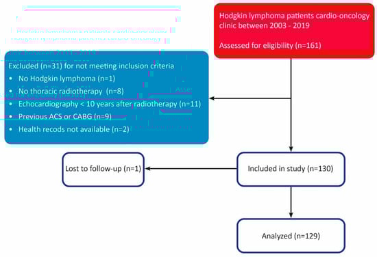 In total, 161 patients were evaluated, 32 of which were excluded for analysis. The inclusion process is shown in the strobe diagram in Figure 1. After the selection process, 129 patients were eligible for analysis. The baseline characteristics of the study population are shown in Table 1. The majority of the study population consisted of women (N = 79, 61.2%). The median age of the study population at diagnosis was 24.4 [p25;p75: 18.8;29.0] years. Seventy-nine patients (61.2%) were treated additionally to radiotherapy with anthracyclines, with a median cumulative anthracycline dose of 210 [150;300] mg/m2. Fifty-four patients (41.9%) were treated with mediastinal irradiation, 46 patients (35.7%) with mantle field radiotherapy, 24 patients (18.6%) with subtotal radiotherapy, and 4 patients (3.1%) with another type of radiotherapy. The mean cumulative radiation dose was 36 [35;40] Gy. No significant differences in baseline characteristics were found between patients with the primary outcome versus patients without the primary outcome.