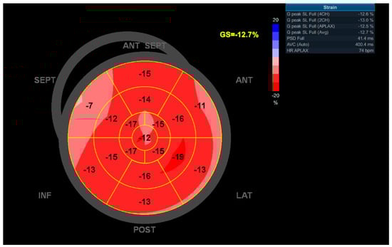 Figure 2 shows a Bulls-Eye longitudinal strain map of a 36-year-old woman who was diagnosed with CHL in 1999 and treated with chemotherapy and mantle field radiotherapy. Echocardiography at index visit in 2015 showed impaired LV GLS of −12.7% and LVEF of 48%. This patient had a grade 1 diastolic dysfunction and an E/e’ mean of 8.8. In 2017, this patient was admitted for HF due to non-ischemic cardiomyopathy, most probably caused by prior chemotherapy.