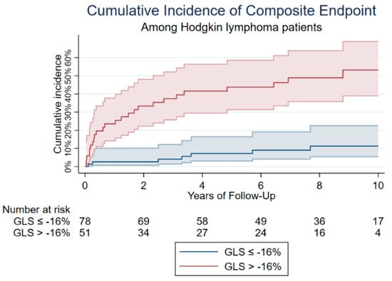 Univariable Cox regression was performed followed by multivariable Cox regression adjusted for gender, age at index visit, and the presence of the predefined cardiovascular risk factors at baseline. Patients with a LVEF < 50% had a three-fold increased risk of cardiovascular events and cardiac death (HRadj = 2.98, 95% CI = 1.22–7.29, p = 0.016). Diastolic dysfunction, assessed by E/e’ (HRadj = 1.16, 95% CI = 1.09–1.22, p = <0.001) and a grade > 0 (HRadj = 3.63, 95% CI = 1.04–12.70, p = 0.044) also showed a relationship with the primary outcome. Finally, LV GLS > −16% was significantly associated with an increased risk of the composite outcome (HRadj = 3.95, 95% CI = 1.83–8.52, p = <0.001. A cumulative incidence curve for the composite endpoint was constructed for GLS > −16% versus GLS ≤ −16% (Figure 3).