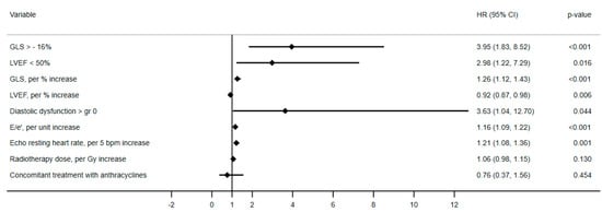 As CHL is mostly diagnosed at a young age, it is important to monitor cardiac function in these patients, and long-term follow-up including echocardiographic screening is recommended, preferably starting around 10 years after CHL diagnosis [,]. An increasing number of studies describe findings on echocardiographic changes after thoracic irradiation [,], including left ventricular (LV) diastolic and systolic dysfunction []. LV systolic function is usually assessed by left ventricular ejection fraction (LVEF) []. However, recent research has shown that measuring global longitudinal strain (GLS) can lead to earlier detection of subclinical LV dysfunction [,,,]. Nevertheless, the association between LV dysfunction and cardiac events after radiotherapy has not yet been investigated. Therefore, the purpose of this study was to evaluate if LV dysfunction is associated with an increased risk of cardiovascular events in CHL survivors treated with thoracic radiotherapy. This study focused on the value of conventional echocardiographic parameters of LV systolic and diastolic dysfunction as well as LV strain assessed by GLS in relation to the cardiovascular outcome.