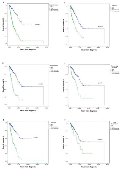 Kaplan-Meier analyses showing overall survival in patients with MF. (A) Univariate analysis for overall survival by hypertension. (B) Univariate analysis for overall survival by diabetes. (C) Univariate analysis for overall survival by dyslipidemia. (D) Univariate analysis for overall survival by pulmonary disease. (E) Univariate analysis for overall survival by smoking. (F) Univariate analysis for overall survival by renal dysfunction.