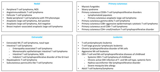 Peripheral T-cell lymphomas (PTCLs) are neoplasms of mature T cells or natural killer (NK) cells. PTCLs are a heterogeneous group of rare lymphoid malignancies, comprising 31 entities in the updated 2017 World Health Organization (WHO) classification [1]), which can be classified into 4 groups: nodal, extranodal, leukemic and primary cutaneous (Figure 1). PTCLs account for only 5–10% of all noncutaneous lymphomas, with geographic and ethnic variations [2,3,4]. The pathogenesis and the mechanisms of PTCL transformation are complex and have begun to be deciphered in recent years [5].
