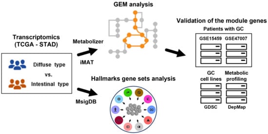 Overview of this study. Gene expression profiles of Lauren diffuse and intestinal GC subtypes were used to extract subsets of GEMs (i.e., all metabolic reactions in a cell) using iMAT and Metabolizer. The genes in GEM modules were validated in independent GC datasets. To identify functional contexts, gene set analysis for hallmark gene sets from MSigDB was applied to the gene expression profiles. GC: gastric cancer; TCGA: the Cancer Genome Atlas; STAD: stomach adenocarcinoma; GEM: genome-scale metabolic model; iMAT: integrative metabolic analysis tool; MSigDB: the Molecular Signatures Database; GDSC: the Genomics of Drug Sensitivity in Cancer; and DepMap: the Dependency Map.