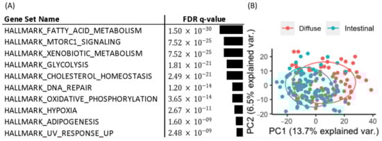 For hallmark gene set analysis, we first calculated t-test statistics and false discovery rates (FDRs) of gene expression profiles of 1379 metabolic genes from the Kyoto Encyclopedia of Genes and Genomes (KEGG) [] in Lauren diffuse versus intestinal subtype. Differentially expressed genes (DEGs) between the two Lauren GC subtypes were obtained using an FDR cutoff of 0.1. Subsequently, statistically significant hallmark gene sets were obtained using the function “Investigate gene sets” in MIT MSigDB [].