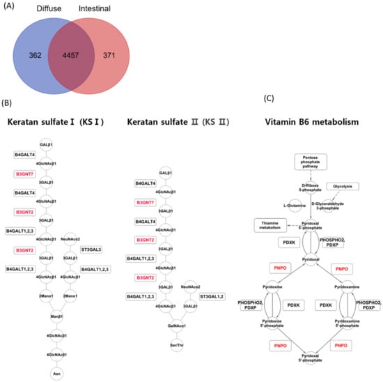 In the iMAT analysis (Figure 3), keratan sulfate and vitamin B6 metabolism were associated with the diffuse and intestinal GC subtypes, respectively. Keratan sulfate is a glycosaminoglycan [] that is covalently attached to protein cores to form proteoglycans and plays important roles in cancer cell migration, angiogenesis, and epithelial-to-mesenchymal transition [,]. Keratan sulfate may contribute to carcinogenesis in diffuse-type GC, but its role in diffuse-type GC needs further study.