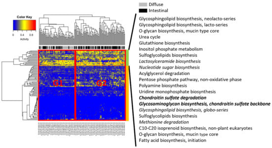 For all samples, Metabolizer [] was used to measure module activities, in which a module consists of sequential metabolic reactions in a subpart of a KEGG metabolic pathway (Figure 4). Two groups were associated with different clinical subtypes, indicated by G1 and G2 in Figure 4. Group G2 had more intestinal subtype patients than G1, whereas G1 had more diffuse subtype patients than G1. Visual inspection of hierarchical clustering revealed that Groups G1 and G2 were more differentiated in the upper part (indicated by the green column bar in Figure 4) than in the lower part (orange column bar in Figure 4). In particular, in the upper part, six modules (lactosylceramide biosynthesis; nucleotide sugar biosynthesis; chondroitin sulfate degradation; glycosaminoglycan biosynthesis, chondroitin sulfate backbone; glycosphingolipid biosynthesis, globo-series; and methionine degradation) were upregulated in diffuse compared to intestinal subtypes, and only two modules (chondroitin sulfate degradation; and glycosaminoglycan biosynthesis, chondroitin sulfate backbone) were significantly activated (adjusted p < 0.01).